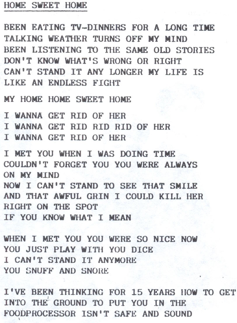Resten av intervjun blev alltför osammanhängande så jag besparar er den. Här kommer istället texten till A-sidans ”Home Sweet Home”: